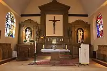 Un grand retable en boiseries occupe le mur du chevet sur toute sa largeur. Son centre est occupé par un Christ en Croix en bois et les parties latérales sont constituées de deux grandes niches abritant des statues. Celle de gauche représente la « Vierge et l'Enfant », elle date de 1769.