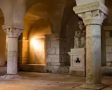 Sous l'église subsiste une crypte préromane, voûtée en arêtes reposant sur six colonnes cylindriques à chapiteaux décorés principalement avec un décor en double collerette de feuillage stylisé. La crypte dont la voûte a été restaurée pourrait dater du XIe siècle[4], et parente de celles de la Trinité de Caen et de la cathédrale de Bayeux[2].