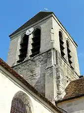 Le clocher est à deux étages. Le premier étage est de style roman et bâti en pierres de moyen appareil, mais ne devrait pas être antérieur aux années 1170, comme l'a montré l'examen de l'intérieur de l'église ; le second étage est bâti en pierre de taille et sans style réel. Ses deux baies abat-son en arc brisé par face sont entourées d'une moulure concave, ce qui indique la période gothique flamboyante, de même que la corniche pourvue de moulures prismatiques. L'on pourrait donc supposer une date comprise entre 1480 et 1540 environ. Seulement le premier étage présente un certain intérêt, plus pour l'histoire de l'église qu'au point de vue de l'histoire de l'art. L'étage est entièrement caché par les combles du côté nord, et non visible depuis l'est en raison de l'impossibilité de prendre suffisamment de recul. À l'ouest, une baie en plein cintre est visible depuis les abords de la sacristie, au nord de la nef. Son archivolte, non moulurée, est surmontée d'un cordon de fleurs de violette excavées, souvent confondues avec les têtes de clous ou pointes-de-diamant, ou même les dents-de-scie. Un contrefort plat est visible près de l'angle. Il diminue en largeur en haut de l'étage. La vue sur les deux contreforts d'angle sud-ouest révèle pourquoi : ici, l'angle rentrant entre les contreforts ainsi dégagé est occupée par une colonnette en délit. Son chapiteau est sculpté de crochets rudimentaires, et indique que le clocher est en effet postérieur à la période romane. Les contreforts s'arrêtent de manière abrupte à l'intersection des deux étages, ce qui montre qu'un deuxième étage roman devait exister. L'étage subsistant n'est donc qu'un étage intermédiaire destiné à faire émerger l'étage de beffroi des combles, ce qui explique l'austérité de la décoration des baies. Les cordons de fleurs de violette des baies méridionales sont par ailleurs partiellement visibles au-dessus du toit du croisillon sud.