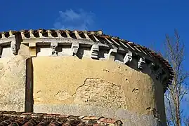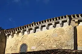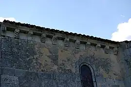 Les modillons de la façade ouest soutiennent une entablement décoré avec des cercles. Certains modillons sont érodés ou ont souffert de dégradations délibérées.