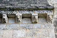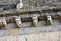 Il y a onze modillons sur la façade occidentale qui datent du XIe siècle. Autour du chevet, se trouvent trente-neuf modillons qui soutiennent une corniche saillante. Cependant, seuls les modillons d'animaux, d'humains et un damier datent de l'époque romane, les autres sont probablement du XIXe siècle.