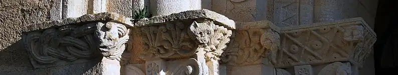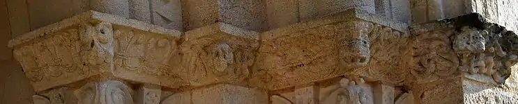 Les seuls reliquats du portail roman originel sont les trois impostes, de teintes différentes, qui associent des masques d'angle grotesques ou des protomés à de beaux entrelacs, ainsi qu'à une frise de palmettes ligaturées. Elles sont taillées dans un calcaire dur à grain fin. Le style des sujets indique une date autour de 1150.