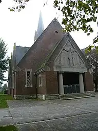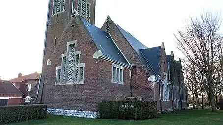 Un clocher hors œuvre se termine par une flèche recouverte d'ardoise.