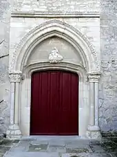Du fait de l'emploi d'une pierre trop tendre, la sculpture est très érodée. Les tailloirs sont sculptés de chimères longilignes, qui se touchent par leur postérieur, et roulent leur queues autour d'elles-mêmes. Chacune des chimères est occupée à dévorer un bras humain. Seulement la chimère à gauche du portail est restée à peu près lisible. Celle tout à droite, entièrement détruite, a été resculptée lors d'une récente restauration. Les chapiteaux à gauche sont sculptés de rinceaux et palmettes assez complexes, dont pratiquement tous les détails sont abîmés. Les chapiteaux à droite représentent chacune une bête féroce munie d'ailes, et occupée à dévorer un corps humain, ainsi qu'un rang de feuillages en bas de la corbeille. Le chapiteau de droite, qui avait en grande partie disparu à l'instar du tailloir, a lui aussi été resculpté. Les bases, de forme conique, n'ont pas été refaites. Quant au pourtour du portail, il a été entièrement remanié à la période flamboyante, et le linteau en anse de panier et les piédroits sont pourvus de moulures prismatiques, qui comportent notamment deux larges gorges. L'extrados du linteau comporte une arête saillante, qui est reçue sur deux petits culs-de-lampe sculptés de feuillages. Leur sculpture évoque plutôt le XIIIe siècle. Au sommet de l'extrados, une console supporte une petite pietà, mal conservée, à l'exception des visages. Les deux bras du Christ et un bras de sa mère manquent. En bas à gauche, un crâne gît par terre. Le tympan lui-même reste nu. Les jambages du portail ont été entièrement refaits lors de la récente restauration. Les quatre assises n'ont pas été moulurées[4],[9].