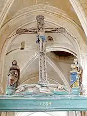 - Le tableau ou panneau peint représentant le Christ en croix entre la Vierge de douleur et saint Jean mesure 150 cm de largeur et 47 cm de hauteur, et date du XVIIe siècle. La scène est peinte sur un médaillon sous la forme d'un cuir découpé, qui est flanqué de deux bouquets de fleurs dans des vases. La croix est enlacé par un homme barbu qui pleure Jésus mort. Un paysage est figuré en arrière-plan. Le panneau constitue probablement la prédelle d'un ancien retable[44].
