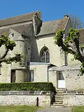 Le mur méridional du croisillon sud paraît également avoir été refait au XIXe siècle. À l'angle sud-est, l'on voit toutefois une tourelle d'escalier de la période flamboyante, qui est agrémentée d'un pinacle plaqué à son angle sud-ouest. Le toit en appentis actuel ne devrait pas correspondre au projet initial, qui devait prévoir un dôme ou une coupole en pierre, ou bien un toit en poivrière. Le mur du chevet du croisillon présente la trace d'une fenêtre à lancette unique en arc brisé, qui entame largement le demi-pignon du toit en appentis, et témoigne d'une hauteur plus considérable des croisillons avant leur remaniement au début du XVIe siècle. À l'est de la croisée du transept, au-dessus du mur méridional du chœur, l'on voit l'un des contreforts de l'ancien clocher, qui se termine en dessous de la corniche, en haut de l'étage intermédiaire. Ses fenêtres en plein cintre bouchées, au sud et au nord, ont déjà été signalées, ainsi que le corniche de modillons et le faisceau de colonnettes tronqué rappelant l'étage de beffroi du clocher du XIXe siècle, démoli en 1832. L'intérêt du mur méridional du chœur réside en sa fenêtre, dont les meneaux sont précédés par des tores, et dont le meneau central porte un petit chapiteau rond seulement ébauché. L'arc en tiers-point est surmonté d'un mascaron, qui pourrait provenir de la corniche de l'ancien clocher. Au pied de la fenêtre, se trouve la sacristie, qui est sans caractère. Le chevet est caché par l'ancienne maison d'école bâtie vers 1818, et servant actuellement d'habitation[4],[6].