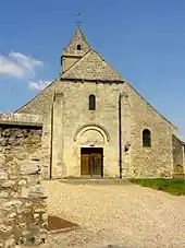 La façade occidentale a retrouvé a peu près sa configuration d'origine de la fin du XIe siècle, même si elle n'est plus authentique dans tous ses aspects. D'une grande sobriété et presque dépourvue d'ornementation, elle est structurée verticalement par les contreforts plats de la nef. Ils présentent latéralement un ressaut respectivement au nord et au sud. La limite des toits en appentis était située un peu en dessous. Sur le mur occidental du bas-côté sud, l'on distingue encore une différence de l'appareil le long de la ligne où le demi-pignon a été rehaussé. Les bas-côtés sont bâtis en moellons irréguliers, et la nef en pierres d'appareil. Des contreforts biais épaulent les angles des bas-côtés. De l'avis de Jules Formigé, ils dateraient du XIIIe siècle. Chacun des bas-côtés reçoit le jour par une baie en plein cintre, dont celle de droite a été refaite en 1987 après la démolition de l'annexe servant de dépôt. Ces baies ne montrent pas de véritable ébrasement à l'extérieur, le double ébrasement n'apparaissant qu'au XIIe siècle. En haut du mur de la nef à la naissance du pignon, court une corniche de modillons sculptés assez espacés. Ils portent une tablette où sont taillées des billettes, que l'on ne distingue plus guère, pas plus que les motifs de la sculpture des modillons. En dessous, une baie en plein cintre légèrement plus étroite que celles des bas-côtés éclairent la nef, qui a perdu toutes ses autres fenêtrées. Cette baie a elle aussi été refaite ; elle a longtemps été bouchée et avait été remplacée par une baie rectangulaire sans caractère. Le portail occidental se compose d'un linteau en bâtière ; d'un tympan nu mais qui était encore enduit au moment du classement et sans doute peint ; et d'une archivolte en plein cintre. Il est décoré d'un rang de billettes et d'un rang de damiers, et retombe sur deux petites têtes grimaçantes. Cet archivolte ressemble à celui, muré, de l'église Notre-Dame de Saint-Clair-sur-Epte. Les vantaux en bois rectangulaires datent du XVe siècle et sont assemblés de panneaux décorés de serviettes, fixés à deux traverses et une écharpe par des clous en pointe-de-diamant traversant des rosettes en fer découpé. La corniche est rapporté et évoque le XVIe siècle[17],[18].