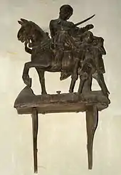 - Le groupe sculpté en bois taillé représentant la Charité de Saint-Martin mesure 92 cm de hauteur, et date de la limite XVe / XVIe siècle. Il n'y a pas de traces de polychromie. Les dimensions restreintes donnent à penser qu'il était destiné à être promené lors des processions. Selon Agnès Somers et Catherine Crnokrak, « les détails sont travaillés dans un souci décoratif et anecdotique agrémentant une composition courante ». Une restauration a été effectuée, et l'épée ainsi que les oreilles du cheval ont été refaites. Le classement remonte à 1965[23],[24].