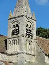 La scansion horizontale est apportée par une tablette dont l'arête inférieure est découpée en biseau et garni de billettes, entre le rez-de-chaussée et l'étage intermédiaire ; un bandeau mouluré, entre l'étage intermédiaire et l'étage de beffroi (à l'ouest seulement, sinon une simple tablette) ; et une corniche de modillons sculptés en masques, en haut de l'étage de beffroi. L'étage intermédiaire est agrémenté, à l'ouest et au sud, d'arcatures plaquées en plein cintre, qui s'enchevêtrent, et reposent sur un total de six colonnettes en délit aux chapiteaux diversement sculptés. Ni les arcades, ni les blocs cubiques tenant lieu de tailloir ne sont moulurés, mais les chapiteaux présentent des godrons, des stries obliques, et des têtes ou des volutes d'angle combinées à des palmettes au milieu des faces des corbeilles. Ce type d'arcatures est typique du style roman normand. Quant à l'étage de beffroi, il est ajouré de deux étroites baies en plein cintre gémelées par face, qui s'ouvrent entre trois colonnettes à chapiteaux, et sont surmontées d'un arc de décharge également en plein cintre, qui repose sur deux autres colonnettes à chapiteaux. Le tympan est nu. Si cette disposition n'est pas rare, ce n'est qu'à Bruyères-sur-Oise que l'on trouve un unique arc de décharge par face. Ailleurs, le nombre de baies par face est double (Béthisy-Saint-Martin, Chamant, Glaignes, Jaux, Néry, Orrouy, Saint-Vaast-de-Longmont). Les chapiteaux affichent les mêmes motifs que sur les arcatures, ainsi que des roues à douze rayons comme réminiscence des rosettes des chapiteaux corinthiens, des feuilles d'angle plates, deux arcatures en plein cintre plaquées par face, ou des motifs seulement ébauchés. Quant à la flèche, elle est de plan octogonal, et ses arêtes sont garnies de boudins, alors que les pierres sont sculptées de dents de scie en bas-relief. La flèche n'est pas ajourée, mais percée de nombreuses trous de boulin. Elle est cantonnée de quatre clochetons sur plan rond, qui sont sommées d'une boule[16].