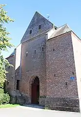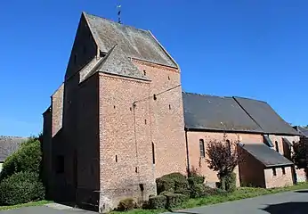 - Extérieur : le clocher-donjon rectangulaire, flanqué de deux tours carrées, est en brique, matériau de presque toutes les églises fortifiées de Thiérache.