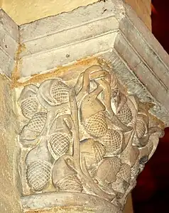 - Le chapiteau VI, une sculpture symétrique de rinceau ligaturé et pommes de pin.