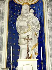 - La statue de la Vierge à l'Enfant est en pierre taillée, et a le revers plat. Elle mesure 190 cm de hauteur, et date du premier quart du XVIe siècle. Initialement polychrome, elle a été badigeonnée de blanc au XIXe siècle, et la couronne, ainsi que les bordures du voile et du manteau ont été dorées. La Vierge se tient debout, dans une posture légèrement déhanchée. Le regard serein, un peu perdu, elle porte l'Enfant Jésus assis sur son avant-bras gauche, sans vraiment lui porter attention. Le Fils, simplement vêtu d'un drapé qui lui couvre les jambes, tient un oiseau dans sa main gauche et lui donne un fruit à manger de sa main droite, tout en approchant sa tête de celle de sa mère. Les fleurons de sa couronne sont cassés, et l'état global de l'œuvre est insatisfaisant. C'est l'une des deux premières statues de l'église qui ont été classées au titre objet en mai 1905[18].