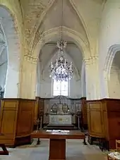 Le doubleau intermédiaire est analogue à l'arc triomphal. Aux colonnettes du rouleau supérieur, s'associent celles des ogives et des formerets, ce qui donne des faisceaux de trois fines colonnettes dans chacune des angles des deux travées. Dans la première travée, les ogives adoptent le profil d'une arête entre deux tores déjà rencontrée dans la base du clocher, et la clé de voûte est une délicate rosace piquée au trépan, dont le diamètre atteint déjà celui des ogives, contrairement à la période romane. Mais l'écart stylistique entre la base du clocher romane et le chœur n'est, somme toute, pas très importante. Dans la seconde travée, les ogives, et sans doute aussi les voûtains, ont été refaits à la période flamboyante, selon un profil analogue au bas-côté de la nef. La clé de voûte est un écusson fruste. Subsistent toutefois les formerets toriques d'origine. Les élévations latérales ne présentent que des hautes arcades sans supports ni mouluration ; elles ont simplement les arêtes taillées en biseau et n'étaient pas encore prévues au moment de la construction. Seule l'arcade, moins élevée, fait exception : sa partie supérieure a été entaillée de trois facettes concaves à la période flamboyante, en épargnant les jambages. Quant à la fenêtre du chevet, elle est analogue à celle de la chapelle latérale sud, et doit être datée dans le contexte de celle-ci ; les lancettes à têtes trilobées et le profil chanfreinée aigu préfigurent déjà le style flamboyant, tandis que le pentalobe en haut rappelle le style rayonnant[5].