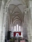 Le vaisseau central est doté d'une voûte d'ogives retombant sur des corbeilles feuillagées portées par des culs de lampe figurés évoquant le début du XIIIe siècle[3].