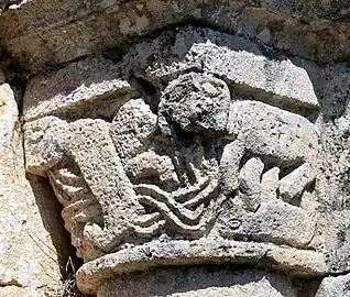 - Le grand arc présente une rangée de larges étoiles et repose du côté de l'ouest sur le tailloir en damier d'un chapiteau sur lequel on distingue un groupe de personnages, debout, accroupi ou renversés. On peut distinguer un personnage humain, nu, et sur l'astragale les traces griffues des pattes d'un monstre. Il s'agit probablement d'une représentation d'un homme qui a mis sa main dans la gueule d'un lion. Le tailloir du chapiteau est décoré avec un damier.