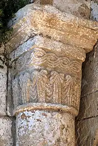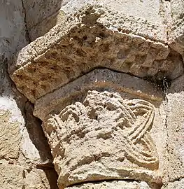 - Le petit arc, sans ornementation, repose à l'ouest sur un chapiteau décoré avec une rangée de palmiers surmontée d'une frise d'entrelacs simple.