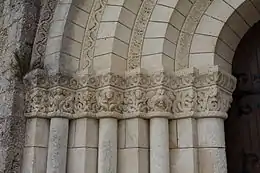 L'architecture complexe de l'église Saint-Martin témoigne de nombreux remaniements au cours des siècles. Les parties les plus anciennes de cette ancienne possession casadéenne semblent remonter au XIIe siècle, époque qui voit fleurir de nombreuses églises romanes dans la campagne saintongeaise[1]. La façade, haute et élancée, se compose de deux registres horizontaux et est couronnée d'un pignon aigu, qui ajoute encore à sa monumentalité. La partie inférieure se compose d'un portail unique en plein cintre, à quatre voussures nues (les claveaux ayant été refaits en 1895) portées par des colonnettes aux chapiteaux ornés d'entrelacs, de visages sculptés et d'oiseaux buvant dans un même calice, ou au contraire se détournant l'un de l'autre[2].