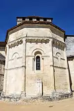 L'ordonnance de l'abside et de l'absidiole Sud est digne d'attention par un cordon horizontal à hauteur de l'appui des fenêtres et couronnées par une corniche que portent des modillons figurés et les chapiteaux des colonnes engagées. La corniche de l'abside principale est d'un type particulier : elle est formée d'un encorbellement continu sur lequel ressortent les modillons plus saillants et assez rapprochés.