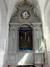 - Le retable du chevet, en bois taillé et peint, est de style baroque, et susceptible de dater du XVIIe siècle. Il occupe tout le pan axial de l'abside. Seulement la partie basse reste libre. On y trouve une niche murale servant de rangement pour les objets liturgiques avant la construction de la sacristie. L'autel de célébration, en forme de tombeau galbé, comporte également des placards accessibles de derrière. Avec son tabernacle, qui se présente comme un édicule baroque orné de colonnettes torsadées, il a été avancé à la suite de la réforme liturgique, bien que ne permettant pas la célébration « face au peuple ». Le retable est très plat. Il est destiné à servir d'écrin à un grand tableau au cadre cintré, qui n'existe toutefois plus, et a été troqué contre un plus petit tableau représentant le Christ en croix entre la Vierge de douleur et saint Jean. Le tableau est cantonné de deux paires de pilastres ioniques cannelés et ornés de perles, qui supportent des sections d'entablement garnies de fleurs sculptés en bas-relief, avec un rang de denticules et un rang d'oves et de dards dans l'échine de la corniche. Il existe un second registre, qui comporte au centre un panneau carré ajouré d'un grand oculus, qui ouvre la vue sur le vitrail de la Charité de Saint-Martin déjà signalé ci-dessus. Le panneau est flanqué de deux ailerons et sommé d'un fronton cintré, où se profile une tête de chérubin au-dessus d'un collier d'ailes, tandis que des chutes de fleurs retombent à gauche et à droite.