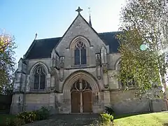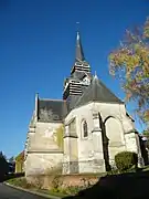 L'église de style gothique flamboyant est construite en pierre et recouverte d'ardoises. Son plan a ceci de particulier que la nef centrale est flanquée de bas côtés perpendiculaires aux cinq travées. Le chœur est terminé en abside arrondie. Un clocher terminé par une flèche recouverte d'ardoise coiffe la croisée du transept. Le portail double avec arcade en anse de panier et les fenêtres gothiques flamboyantes ont été restitués.