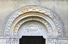 À l'extérieur, près de la sacristie, se trouve sur le tympan trilobé d'une ancienne porte d'entrée qui donnait dans le chœur. Y figure saint Martin dans une représentation rare : en évêque avec deux anges en adoration, contrairement à sa représentation commune en saint Martin partageant son manteau.