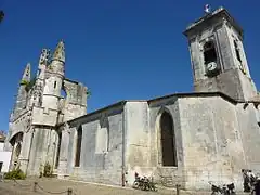 Cependant cette église devait être ruinée moins d'un siècle plus tard. L'île de Ré, à majorité protestante, est mise à sac par ces derniers en 1586 lors des guerres de Religion contre les catholiques. L'église s'effondre en grande partie : il n'en restera que la base des murs de la nef et les chapelles latérales et les hauts murs du transept, conservés du fait de leur importance militaire, étant fortifiés.