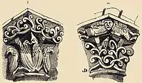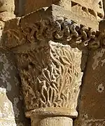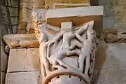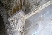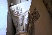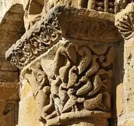 La corbeille d'un des chapiteaux du sud est entourée de feuilles à crochets. Un autre est formé de feuilles surmontées de raisins, avec un tailloir couvert d‘entrelacs.