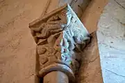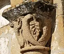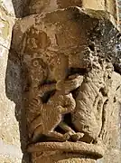 Le chapiteau est bi-facial. Il y a deux couples d'oiseaux adossés qui détournent leurs becs pour picorer une pigne (fruit de vie). Deux des oiseaux sont entiers et on peut voir que leurs pattes serrent des fruits sphériques, le fruit défendu ou malum et attribut de Satan. Ces oiseaux sont donc malfaisants.
