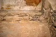 Le chapiteau a été sculpté in situ et le tailloir est, en partie, resté à l'état brut.