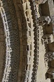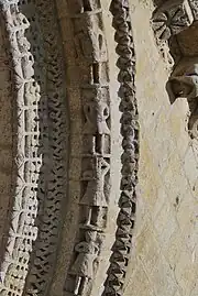 Chaque arc est composé de deux parties : de l’arc proprement dit formé d’une suite de claveaux, et, au-dessus, d’un cordon ou archivolte qui encadre les claveaux ; les arcs et les archivoltes sont couverts de sculptures de formes très variées.