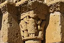 À l'ouest du chapiteau, un oiseau, et un homme bicorporé sur le tailloir et à l'est, l'ébauche d'un homme tenant une crosse en main. Sur le cordon oriental, un couple allongé. Deux hommes nus sont couchés l'un sur l'autre, tête-bêche. L'homme du dessus semble être un démon car il a des jambes velues, des pieds griffus et des cornes de satyre. L'homme du dessous porte une couronne de roi. Tous deux sont barbus, ils rient aux éclats et se tiennent par la main, comme des amoureux.