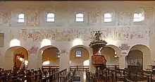 Une restauration très importante eut lieu en 1975. Lors de ces travaux, une petite cave voûtée fut découverte sous la nef centrale et l'on s'aperçut que de vastes peintures murales datant des XVIe et XVIIe siècles étaient conservées dans le vaisseau central sous plusieurs couches de badigeon. Elles furent dégagées en 1981 par M. Jacques Folville. Une peinture murale du XVIIe siècle représente Aure de Paris, première abbesse du monastère colombaniste de Saint-Martial de Paris fondé par Saint Éloi[1].