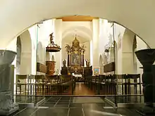 La nef est constituée de cinq travées sur gros piliers carrés, massifs et sans base. Deux ont été remplacés en sous-œuvre, au XVIIe siècle, par des colonnes rondes, sans doute pour faciliter la vue du chœur. Les absidioles des deux petites nefs sont semi-circulaires empâtées et couvertes d'une voûte en cul-de-four. À l'entrée du chœur, on a taillé dans le bas des montants (anciennes bases de l'arc triomphal), pour assurer plus de visibilité vers l'autel ; on y a placé deux colonnettes (de remploi) dont l'une est du roman rhénan cubique. Celle de gauche, simple dé (dorique ?). Il y a une nette coupure entre les nefs où règne le plein cintre et le chœur qui apparaît dans son style du XVIIe siècle avec ses deux grandes fenêtres rectangulaires et avec son retable monumental baroque réalisé par Renier Panhay de Rendeux après 1738.