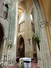Les deux premiers travées du chœur, qui datent du début du XIIIe siècle, ont également été reconstruites au début du XIVe siècle à partir des grandes arcades, à l'instar des croisillons du transept et de la nef. L'architecture est donc proche de celle de la nef, mais le vaisseau est tout aussi étroit que les croisillons, et le raccordement avec le chœur Renaissance a entraîné de lourdes modifications d'un effet particulièrement disgracieux. À l'ouest, le chœur gothique commence exactement comme la nef se termine à l'est. Les grandes arcades sont moins larges que dans la nef. Elles retombent au milieu sur le tailloir octogonal, et non carré à angles abattus, d'un chapiteau sculpté de deux rangs de feuilles polylobées alternant avec des crochets. La base comporte une scotie garni d'un rang de perles ou de dents d'engrenage. À l'intersection des deux travées, les colonnettes des hautes-voûtes sont au nombre de cinq comme dans la nef, mais les fûts correspondant aux formerets sont ici plus grêles que les autres, et chaque fût dispose de son propre socle cubique, ce qui n'est pas le cas dans la nef. Le triforium ne compte que trois arcades dans la première travée, mais est susceptible d'en avoir compté quatre dans la seconde travée. Au sud, n'en restent que les deux premières, et au nord, l'élévation de la seconde travée a été totalement démolie. La grande arcade et le mur haut, dépourvu d'ouvertures, datent de la Renaissance, et sont placés obliquement pour permettre au chœur de s'évaser jusqu'à atteindre la largeur plus importante du chœur Renaissance. Pour cette raison, la voûte de la deuxième travée a dû être refaite, mais avec des ogives d'un profil carré rudimentaire, et sans formerets. Le départ du formeret gothique subsiste au sud, et dans l'angle sud-est, le départ d'une forte arcade Renaissance, dont l'on estime mal la finalité, témoigne en tout cas d'un projet ambitieux de prolongement du complexe Renaissance vers l'ouest[7],[16].
