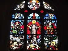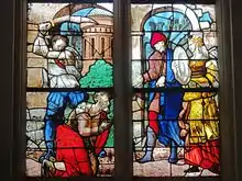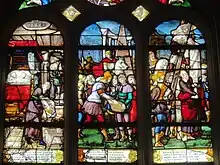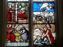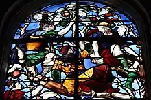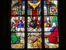 - La verrière dans la dernière travée du second bas-côté sud de la nef (n° 20) n'a pas de sujet fédérateur, et a vraisemblablement été recomposée à la base de bordures et divers fragments. Cette verrière est à trois lancettes trilobées, surmontées de deux losanges, d'un soufflet et de deux mouchettes. Les lancettes comportent, pour l'essentiel, du verre blanc et des bordures, ainsi qu'un écusson provenant de l'actuelle sacristie (de gueules à trois coquerelles d'or[46]) et un petit médaillon de grisaille. Il représente une femme assise et un homme sous ses pieds. À la bordure de ce médaillon, on lisait les mots : « Holopherne. Fortitudo ». Le soufflet contient des débris d'une Cène mal recomposés lors d'une restauration. Judas est encore reconnaissable par son habit jaune. L'abbé Marsaux indique que cette scène est souvent interprétée à tort comme les noces de Cana[47]. Dans les mouchettes, figurent des anges musiciens, et dans les losanges, des phylactères portent les mots « au commencement / était le verbe » (Jn 1,1).