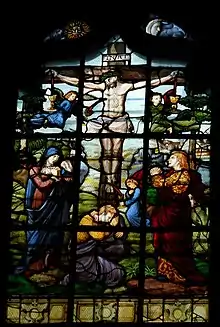 - La verrière de la deuxième travée du second bas-côté sud, sans compter le porche (n° 22) est elle aussi dédiée à la Crucifixion de Jésus-Christ (en plus de la verrière d'axe du rond-point de l'abside). Elle se compose de trois lancettes trilobées, surmontées de trois soufflets très ouverts et de quatre étroites mouchettes. Selon l'abbé Marsaux, le sujet est ici traité d'une façon plus moderne. Comme pour la dormition de la Vierge, il n'y a pas de subdivision en registres. Au milieu, l'on voit le Christ en croix entre le soldat munie d'une hallebarde qui lui assénera le coup de grâce, et la Vierge de douleur. Mais l'on voit en même temps Marie au premier plan à gauche, accompagné par saint Jean et l'une des Saintes Femmes. Les soldats qui font pendant à ce petit groupe ont pour fonction d'équilibrer la scène, mais il semble aussi que le soldat en armure figuré de dos repousse deux Apôtres souhaitant se rendre auprès du Christ, dont l'un est armé d'un couteau. Ce détail n'est pas relaté dans le Nouveau Testament. Quant aux trois soufflets au tympan, ils représentent l'Agonie au jardin des Oliviers (en haut) ; la trahison de Judas, et saint Pierre coupant l'oreille de Malchus (à gauche) ; et le Christ bafoué, insulté, les yeux bandés[47].