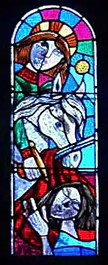 Derrière l'autel au fond de l'église on peut voir un vitrail du peintre René Margotton, le partage du manteau de Saint Martin.