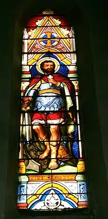 Au-dessus du portail d'entrée : Le bienheureux Pie IX, encadré par saint Pierre et saint Paul. Le choix et la présence d'un portrait de Pie IX nous permet de dater la création des vitraux.