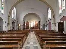 L’église est de style néo-roman, et principalement en béton armé. Le centre de la façade est ornée de la sculpture d'un Christ étendant les bras. La nef est précédée d'un narthex et terminée par un chevet plat[2].