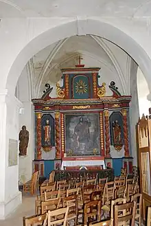 - Le retable imposant en bois naturel se compose de quatre colonnes corinthiennes cannelées et rudentées aux deux-tiers supérieurs. Elles soutiennent une épaisse corniche supportant au droit des colonnes des pots à feu et au centre un médaillon marqué du chiffre JHS. Les chapiteaux, les guirlandes et les rinceaux sont rehaussés de dorure.