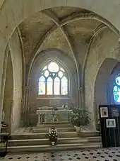 Les chapiteaux sont pour la plupart sculptés de feuilles d'eau ou de feuilles plates en un ou deux rangs, avec parfois des volutes d'angle fortement stylisées, encore typiquement romanes. Au nord-ouest toutefois, la corbeille du chapiteau du rouleau inférieur du doubleau est garnie de nombreuses petites fleurs à six pétales. Malgré la simplicité de la sculpture, Dominique Vermand voit ici les artisans du chantier de la cathédrale Notre-Dame de Senlis à l'œuvre[5]. Les tailloirs sont très sommairement moulurés, et les bases sont trop bien conservées pour pouvoir être considérées comme authentiques. La fenêtre présente un remplage d'un style gothique flamboyant précoce, et aurait été refaite au moment de la construction de la chapelle du nord, autour de 1400[5]. Les meneaux ont des bases gothiques, et affectent un profil aigu. Quatre lancettes, dont celles au centre un peu moins larges que les autres, sont surmontées de deux soufflets sommaires et d'un triangle, ainsi que d'un oculus entre deux mouchettes sommaires. Toutes ces formes sont irrégulières et inabouties, et le réseau semble être l'œuvre d'artisans inexpérimentés, ce qui n'est pas étonnant eu égard la période de construction. Restent à mentionner les deux étroites arcades en tiers-point ouvrant dans les chapelles. Elles ne sont pas moulurées, même pas chanfreinées, mais les angles des piédroits sont néanmoins agrémentés de colonnettes aux chapiteaux de feuilles d'eau. L'authenticité de cette disposition peu courante peu paraître douteuse, mais on note également qu'il n'y a pas de traces de fenêtres latérales, et de petites chapelles du XIIe siècle ont peut-être précédé les chapelles actuelles.
