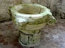 • Les fonts baptismaux sont en pierre calcaire, et se présentent sous la forme d'une cuve baptismale à infusion. Le pied est un épais fût cylindrique, sans base, à moins que celle-ci ne soit noyée dans le sol. Il ne mesure que 50 cm de hauteur. La cuve est de plan rond, de 85 cm de diamètre extérieur, et décorée, en-dessous de la bordure, d'une frise de feuilles de lierre. Elle est cantonnée de quatre éléments en forte saillie, dont l'état de dégradation ne permet plus d'identifier les motifs de leur sculpture. Il devrait s'agir d'une sorte de chapiteau, et la cuve devait être flanquée de colonnettes, comme à Glaignes et Pondron. Les chapiteaux représentent des monstres ou des oiseaux fantastiques, dont des hippogriffes et des dragons. Quelques ragréages ont été effectués au ciment. Le décor et la forme rendent possible une datation du XIIIe siècle. Cependant, l'abbé Beaudry attire l'attention sur le fait que des fonts baptismaux semblables ont été confectionnés pendant plusieurs siècles, à compter du XIIe siècle[20],[21].