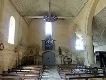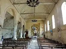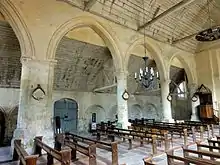 Quant aux plafonds, ils sont analogues à ceux de la nef. Rien ne permet de dire si les lambris se substituent à d'anciennes voûtes en berceau. La fonction du pilastre sommé d'une console à l'ouest du croisillon sud n'est pas claire. Les croisillons voûtés en berceau sont rares dans la région (des exemples existent à Banthelu, Champlieu (églises ruinées), Moussy et Santeuil). Tout aussi rares sont les croisillons non voûtés[15].