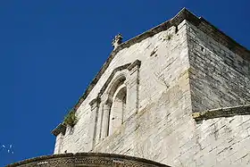 Au-dessus de l'abside occidentale, la partie haute de la façade occidentale, construite en pierre de taille, est ornée d'une fenêtre qui constitue un bel exemple d'art roman provençal inspiré de l'antique : cette fenêtre est encadrée d'élégantes colonnettes et surmontée d'un fronton supporté par des pilastres surmontés de chapiteaux à feuilles d'acanthe.