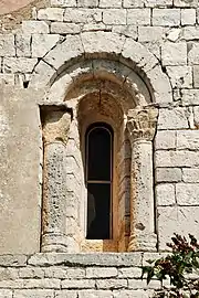 Percée d'une ancienne porte cintrée, elle présente en hauteur deux baies romanes cintrées. La fenêtre orientale est à simple ébrasement et sans ornementation tandis que la fenêtre occidentale est bordée de colonnettes dont les chapiteaux sculptés supportent une archivolte à triple voussure.