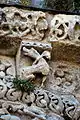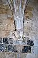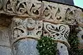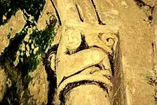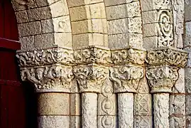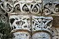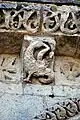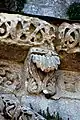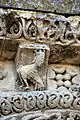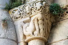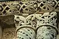 - Les chapiteaux de l’ébrasure nord représentent des griffons ou des lions ailés ; des feuillages ; des oiseaux qui picorent une pigne et des oiseaux dur le dos des lions. Au sud se trouvent des masques humaines et diaboliques au milieu des rinceaux.