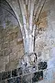 - À l'intérieur, le mur sud de la nef est toujours percé de baies en plein cintre qu'encadrent des colonnettes à chapiteaux sculptés ; il présente aussi les vestiges de corniches également sculptées. Un chapiteau portant un énorme dragon au combat a également été conservé à la retombée de la voûte de la nef.