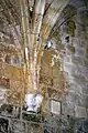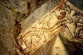 Les premiers arcs de la voûte retombent à droite sur un gros chapiteau roman décoré d'un énorme dragon ailé combattant un quadrupède.