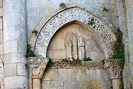 - Le rouleau d'archivolte présente de petits personnages les uns au-dessus des autres. Au sommet, deux personnages semblent parler à un troisième.