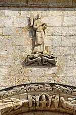- Au-dessus de la porte centrale on trouve six figures sculptées. Les pierres sont placées horizontalement. Il est probable que certaines sculptures étaient destinées à être placée verticalement. La première sculpture est la buste d'un homme, les paumes placés au niveau de sa poitrine. Puis, un évêque avec sa crosse. La troisième semble porter un bouclier sur son épaule, peut-être un chevalier ? À droite, un homme qui porte un objet (livre ?) dans sa main gauche. Il est peut-être l'un des Évangélistes. La cinquième sculpture est celle d'un sirène-poisson. Elle montre la paume de sa main droite et tient un poisson dans sa main gauche. La dernière sculpture est celle d'un lion rampant avec queue fleurdelisée.